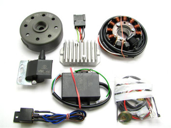 Das Set beinhaltet Stator Grundplatte Rotor Schwungscheibe Zündspule Blinkgeber Regler notwendige Kabel Halteschellen Montagebleche und eine Einbauanleitung mit Schaltplan und Bilder zum Einbau. - TOP - 1012. Die Kabel sind mit Unisteckern voll konfektioniert damit können Sie die.